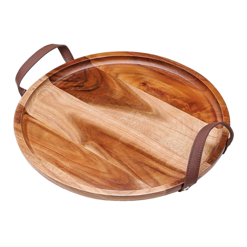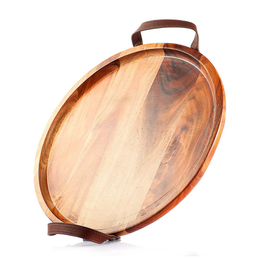 Bandeja Redonda em Madeira com Alça de Couro