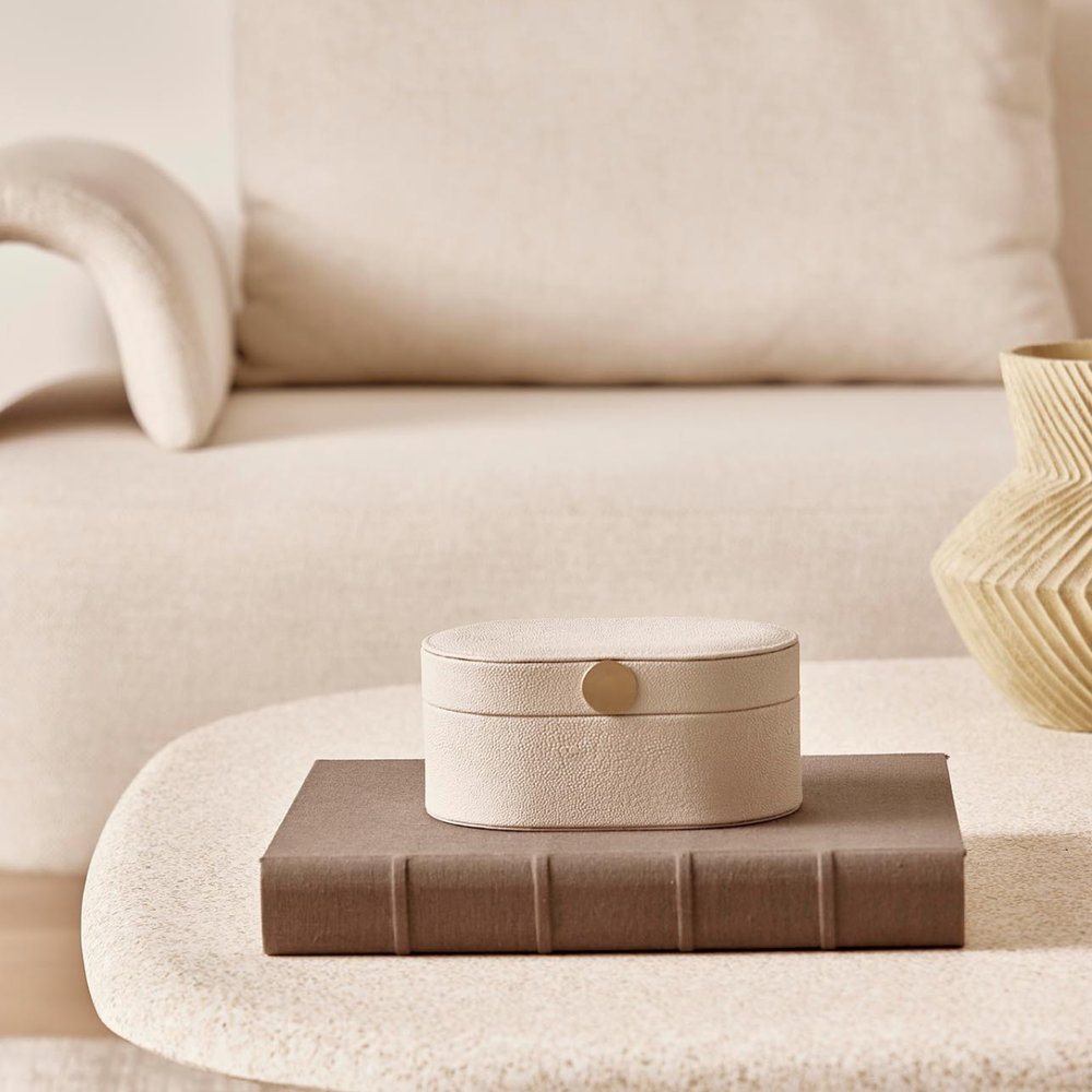 O revestimento em PU confere à caixa uma textura sutil e luxuosa, enquanto seu interior todo revestido em camurça proporciona uma sensação agradável ao toque.