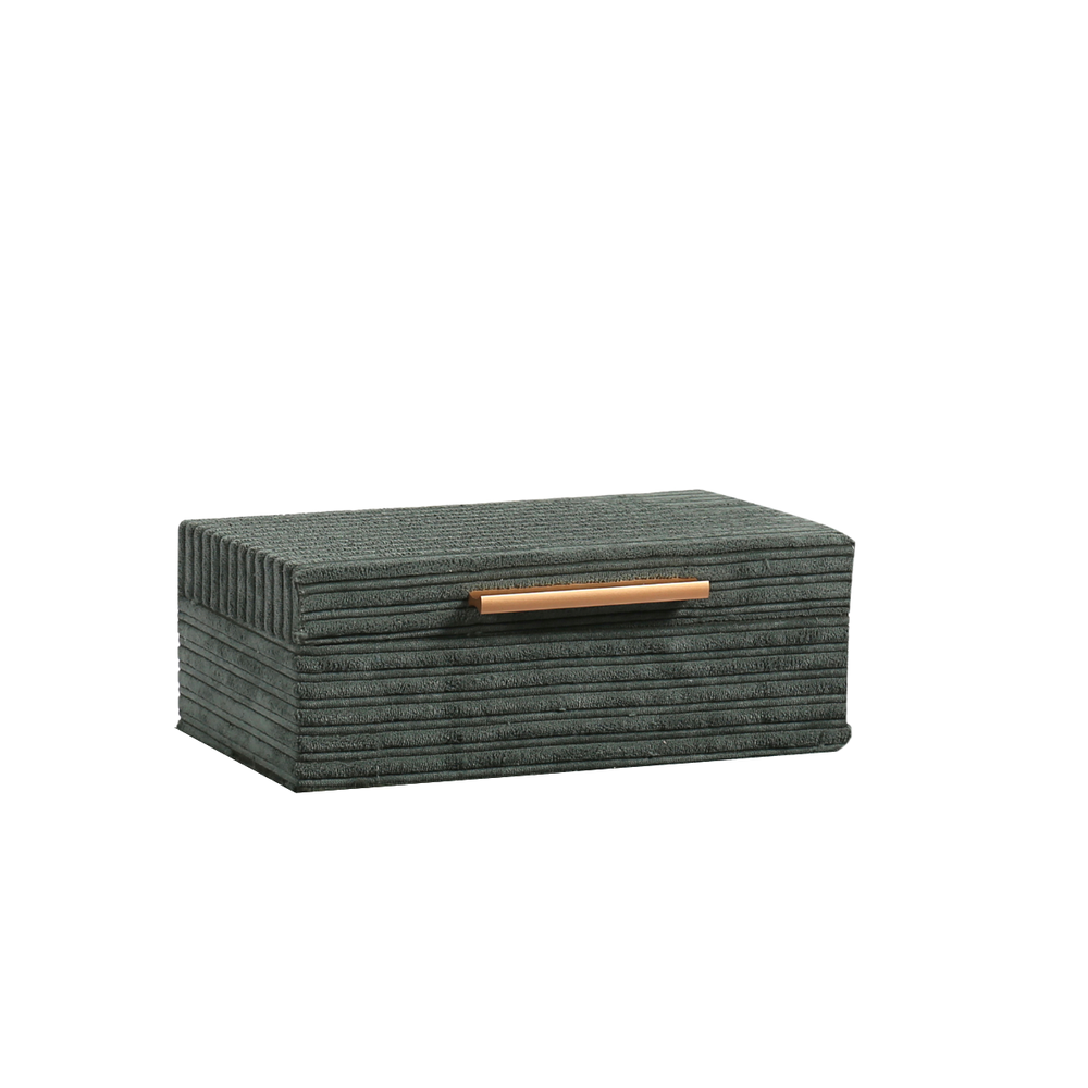 Esta elegante caixa decorativa é confeccionada em MDF, proporcionando estrutura resistente e durável, enquanto o revestimento em veludo verde com listras horizontais oferece um toque aconchegante. O veludo texturizado em listras cria um visual moderno e dinâmico, elevando o design da peça. Para finalizar, o pegador em tom bronze adiciona um toque de contraste e requinte, tornando esta caixa não apenas um objeto funcional para guardar pequenos itens, mas também um belo elemento de decoração para qualquer ambiente que valorize detalhes luxuosos e acabamentos de alta qualidade.
