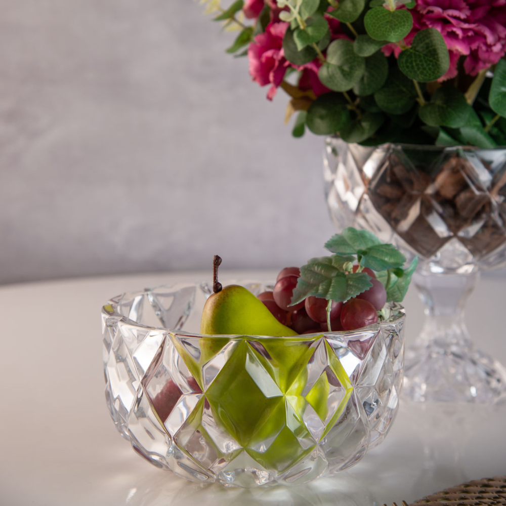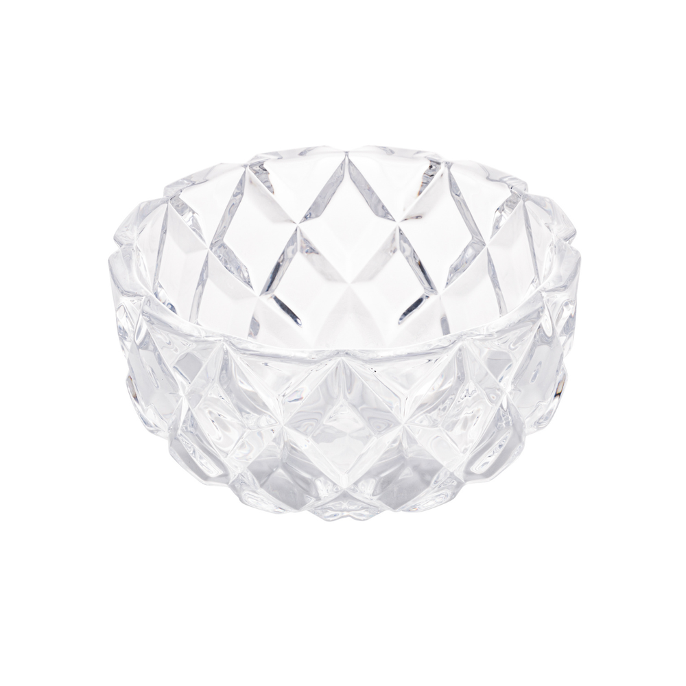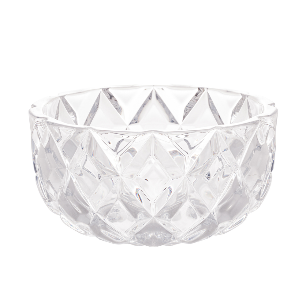 Este centro de mesa redondo, fabricado em cristal ecológico, destaca-se por seu design elegante com formato de losangos em relevo, que remete à lapidação de diamantes. Essa peça não só enriquece a decoração, mas também reflete a luz de forma deslumbrante, criando um efeito visual sofisticado e encantador. Perfeito para complementar a decoração em qualquer ambiente.