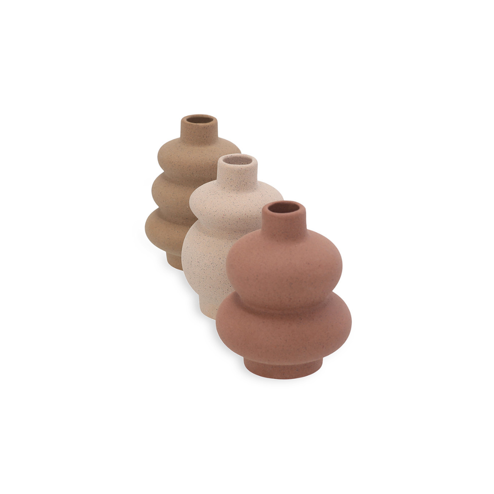 Com design orgânico e formas onduladas, eles trazem um toque de suavidade ao ambiente. Seus tons terrosos, que variam entre o bege e o rosa queimado, adicionam calor e sofisticação, criando um contraste delicado e harmonioso. A textura fosca, semelhante à areia, evoca sensações de serenidade e conexão com a natureza, tornando-os ideais para destacar pequenos arranjos florais ou simplesmente para decorar mesas e prateleiras com charme e elegância.