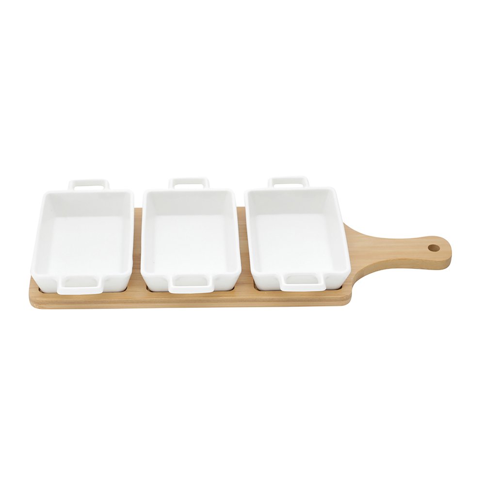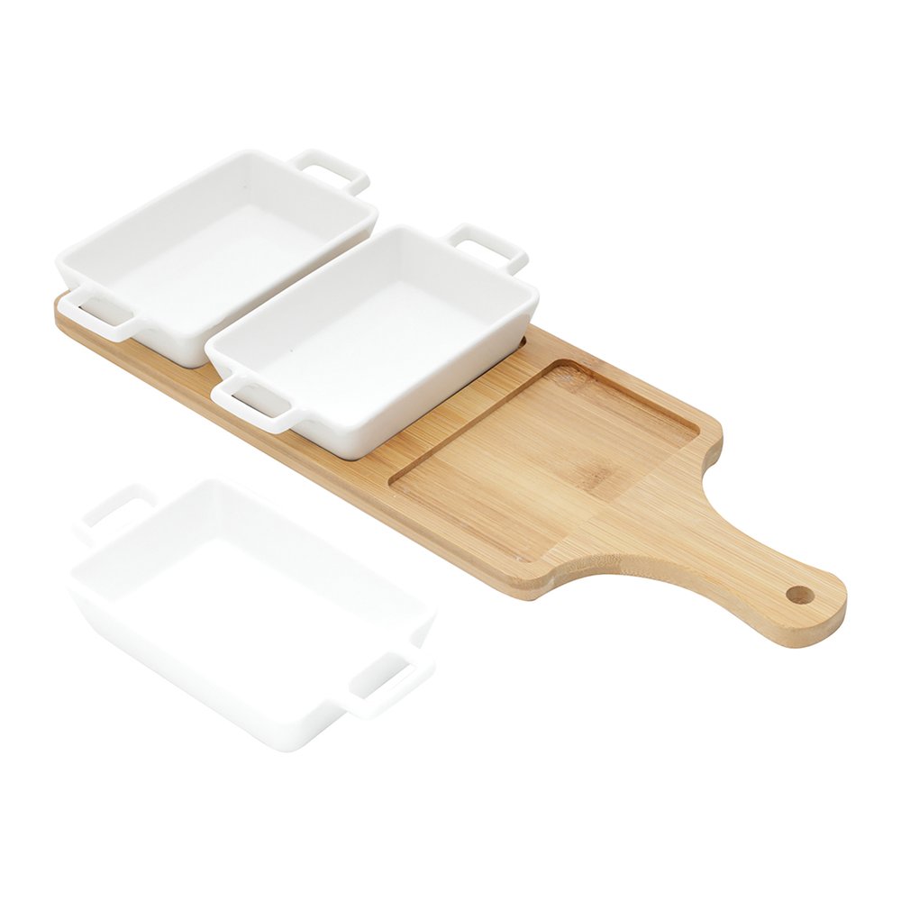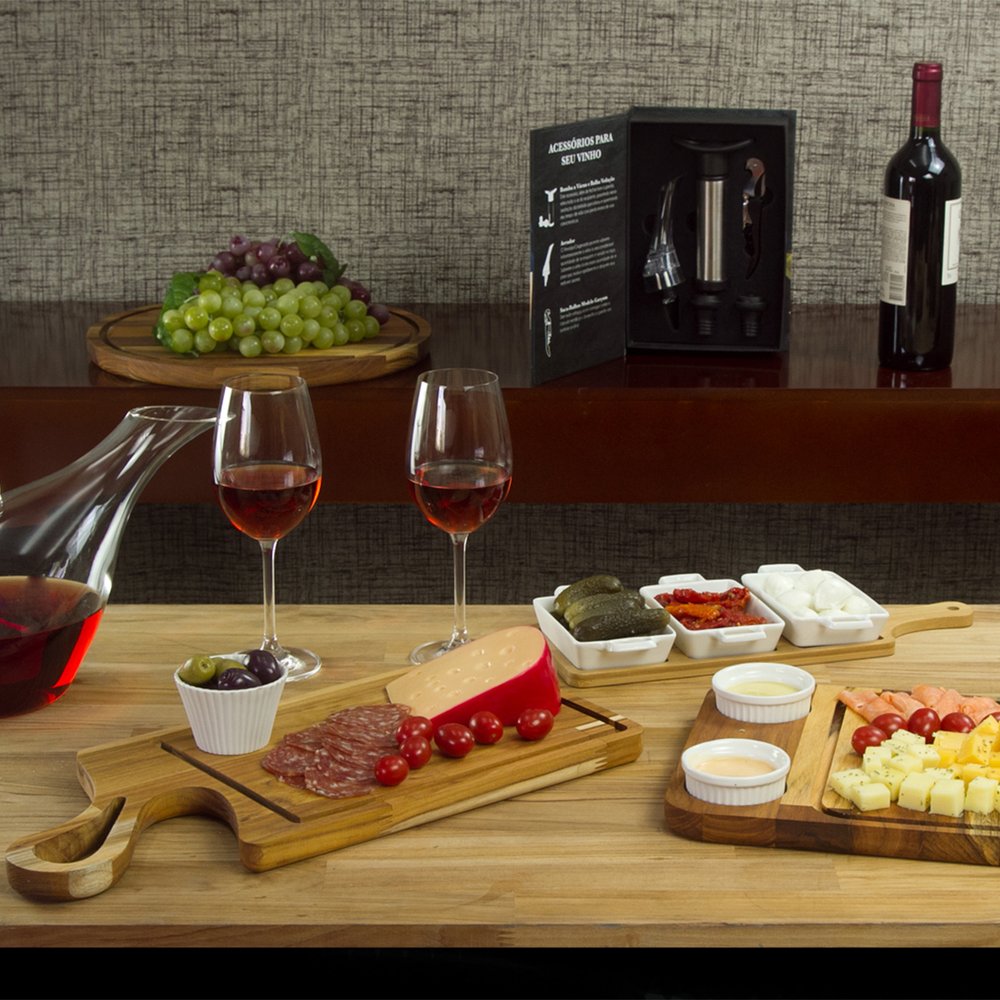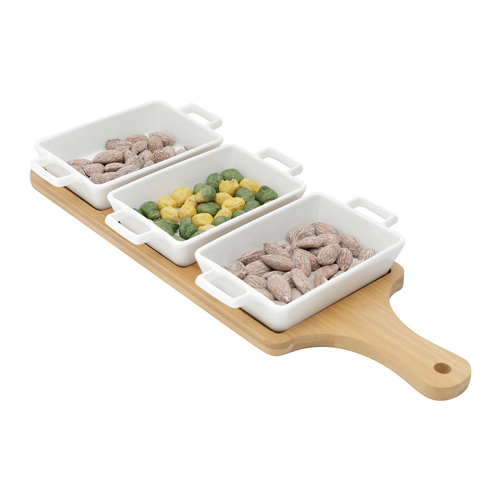 Esta tábua é cuidadosamente confeccionada em bambu de alta qualidade, proporcionando durabilidade e um visual rústico e elegante que certamente chamará a atenção dos seus convidados. As petisqueiras, feitas em porcelana delicada, adicionam um toque moderno ao conjunto, garantindo uma apresentação impecável dos seus petiscos favoritos. O que torna esse conjunto tão excepcional é a sua versatilidade. A tábua oferece espaço para acomodar as três petisqueiras individuais que permitem que você sirva diferentes opções de petiscos, desde queijos e frutas até nozes e azeitonas. Proporcionando uma experiência diversificada e agradável.