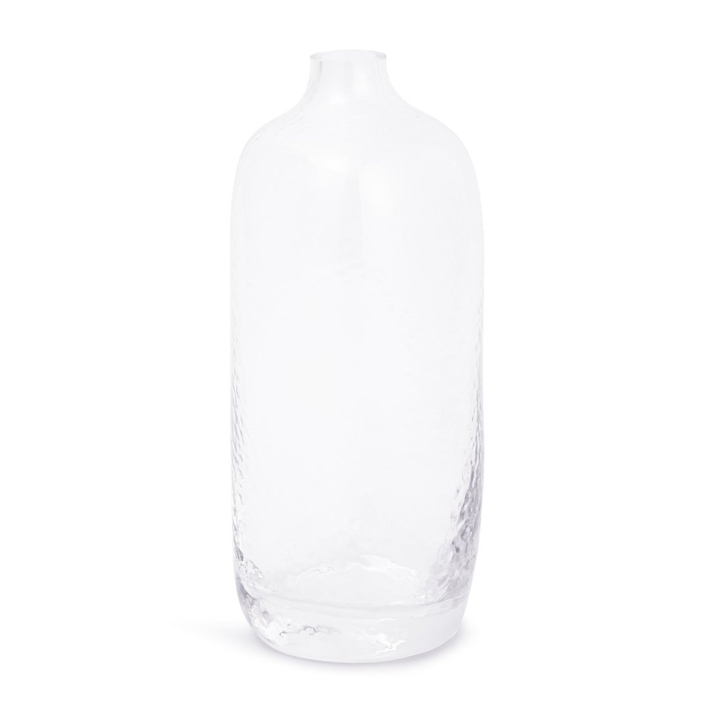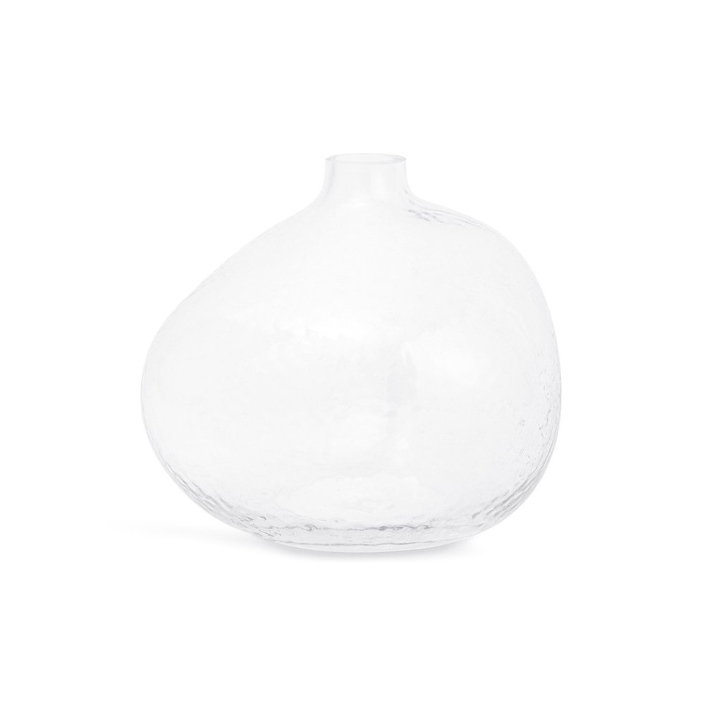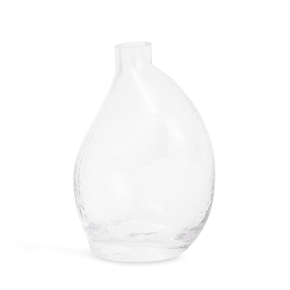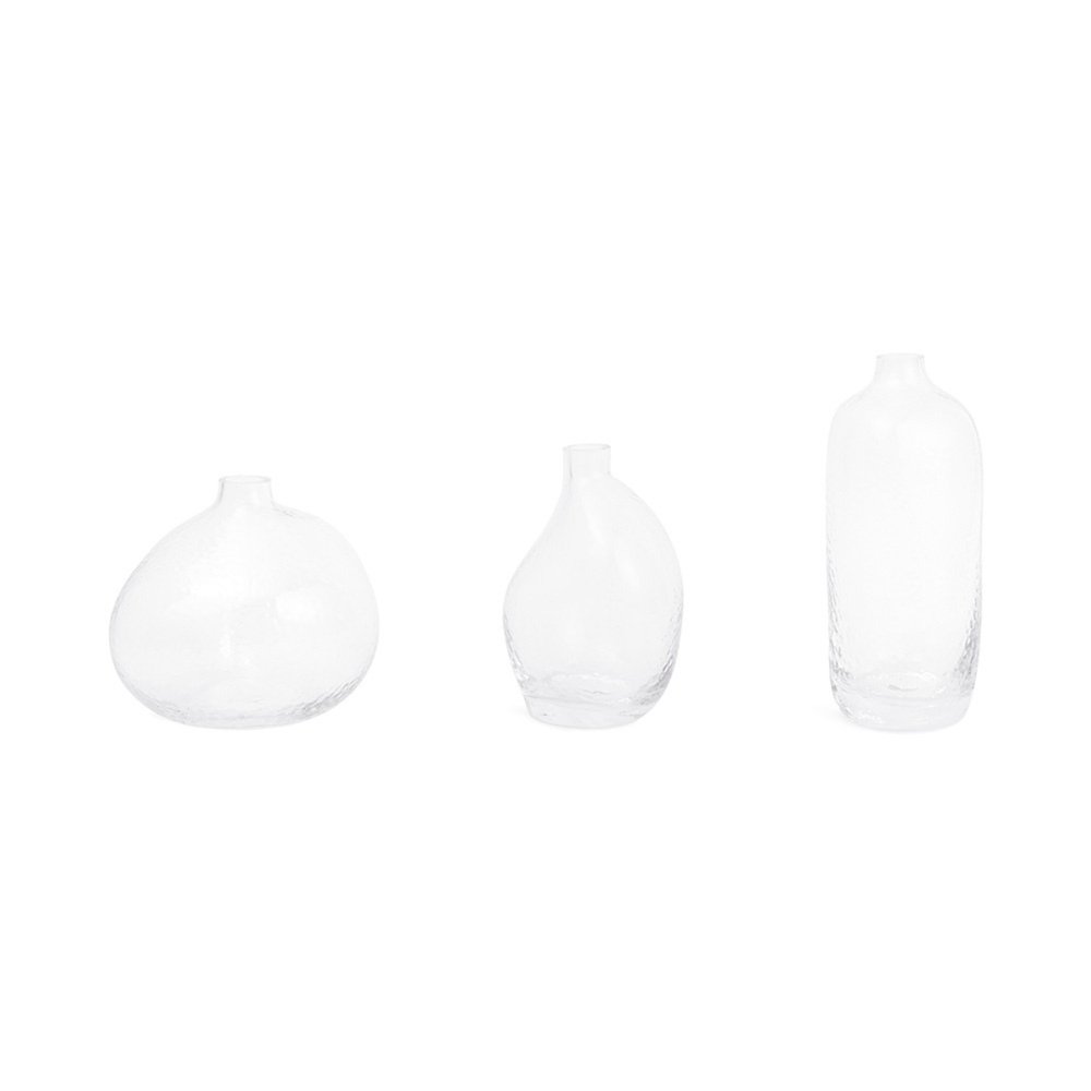Encante seus ambientes com o charme atemporal deste conjunto de vasos. Cada peça apresenta um formato único e curvado, esculpido em vidro martelado que emana elegância e sofisticação.