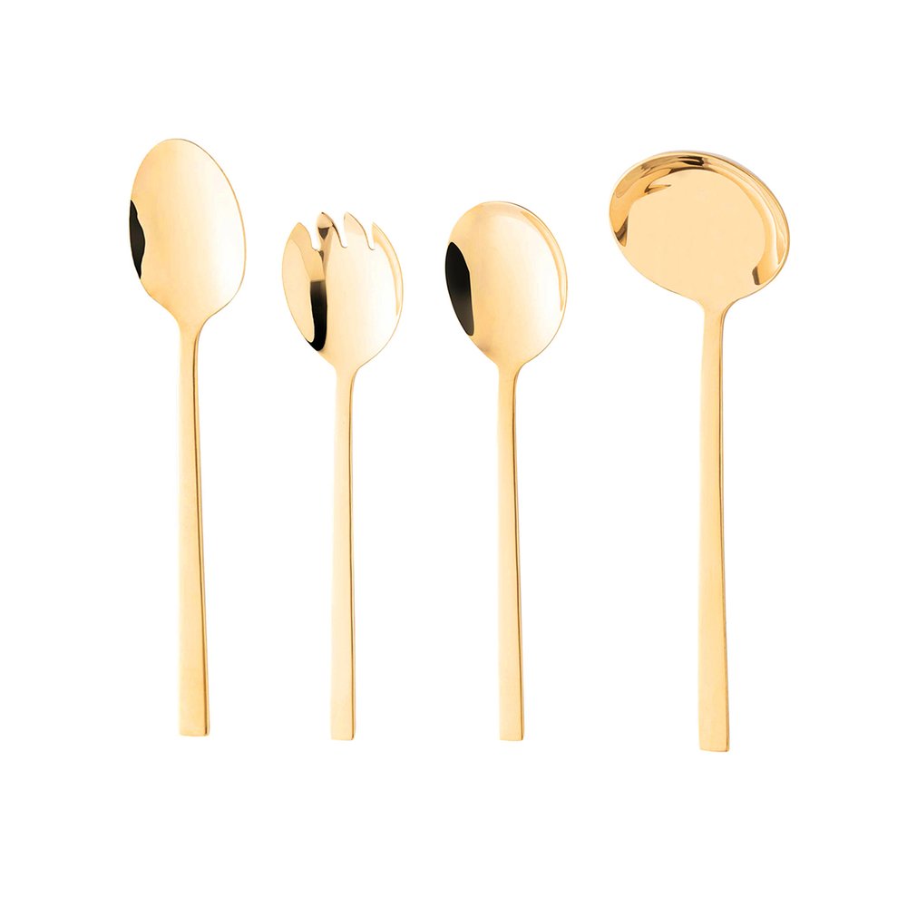 Inclui uma colher de servir, um garfo para salada, uma colher para salada e uma concha, perfeito para complementar suas refeições. Cada peça é meticulosamente elaborada em aço inoxidável premium, garantindo durabilidade e resistência ao longo do tempo. Com um design elegante e contemporâneo, esses talheres adicionam um toque de único à sua mesa, enquanto sua funcionalidade torna o ato de servir mais fácil e agradável.