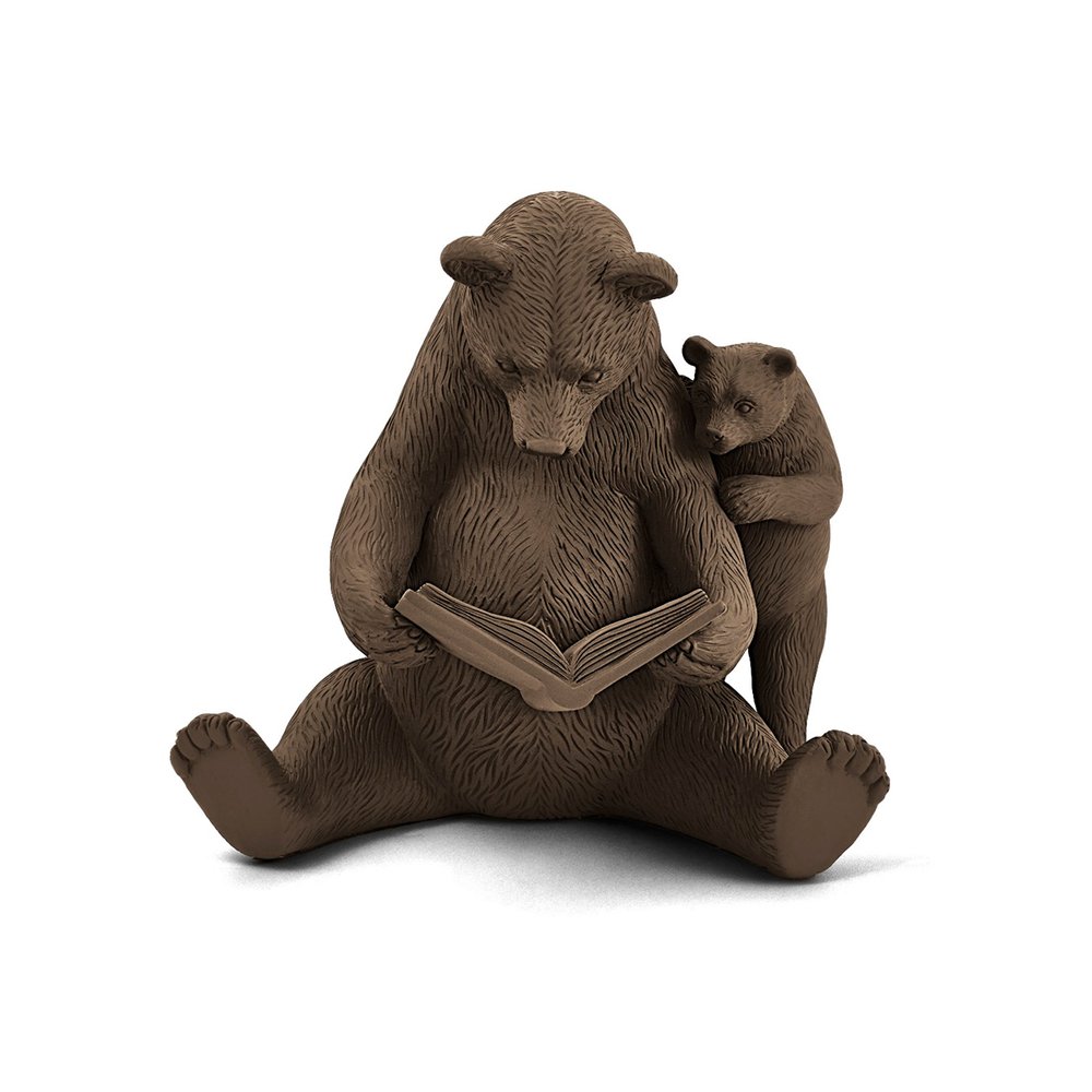 A escultura representa um urso adulto e um filhote sentados lado a lado lendo uma pequena história, imagem que remete afeto e aconchego. Uma decoração feita em poliresina resistente e esculpida com detalhes que encantam, a obra captura a beleza da relação entre pai e filho, entrelaçada com a paixão pelos livros.