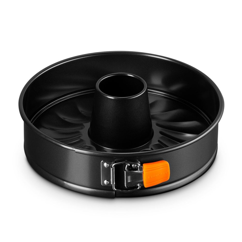 A forma com Fundo Removível Le Creuset, apresenta um furo no meio para receitas deliciosas como bolos, pudins, receitas doces e salgadas também. Para utilizar, solte a trava com capa de silicone para expandir as laterais e libere o fundo para poder formar um bolo redondo e perfeito.