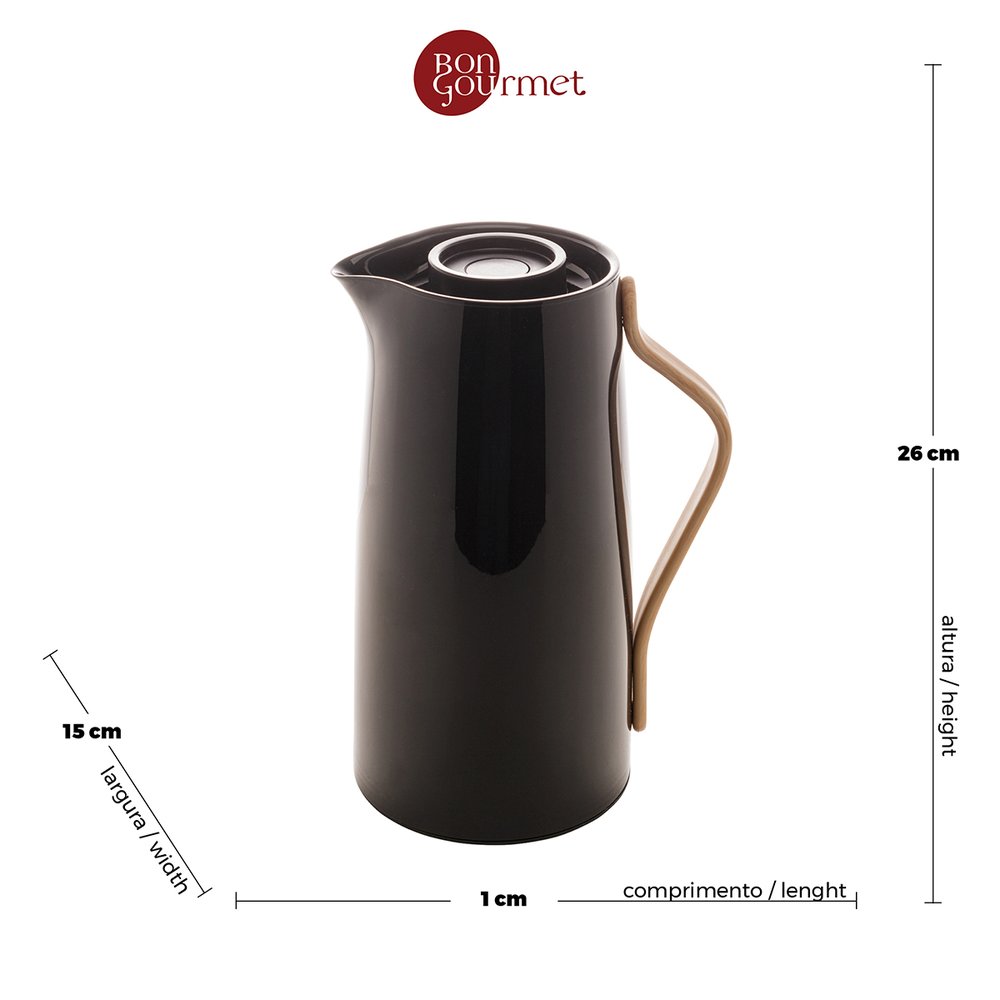 Esta garrafa térmica oferece um material de resistência, traz autenticidade á sua mesa com um acabamento em plástico. Sua ampola térmica de vidro permite que o líquido se mantenha sua temperatura por mais tempo. Assim oferecendo estilo e praticidade para você.