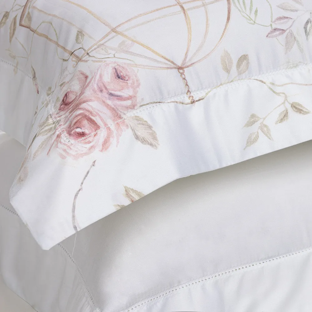 A fronha tem três abas, estampa dimensionada e um elegante acabamento em ponto ajour, que confere delicadeza ao conjunto. A dobra do sobre lençol também é estampada, com o mesmo acabamento em ponto ajour, criando um visual harmonioso. O sobre lençol é tingido, complementando o conjunto com sofisticação.