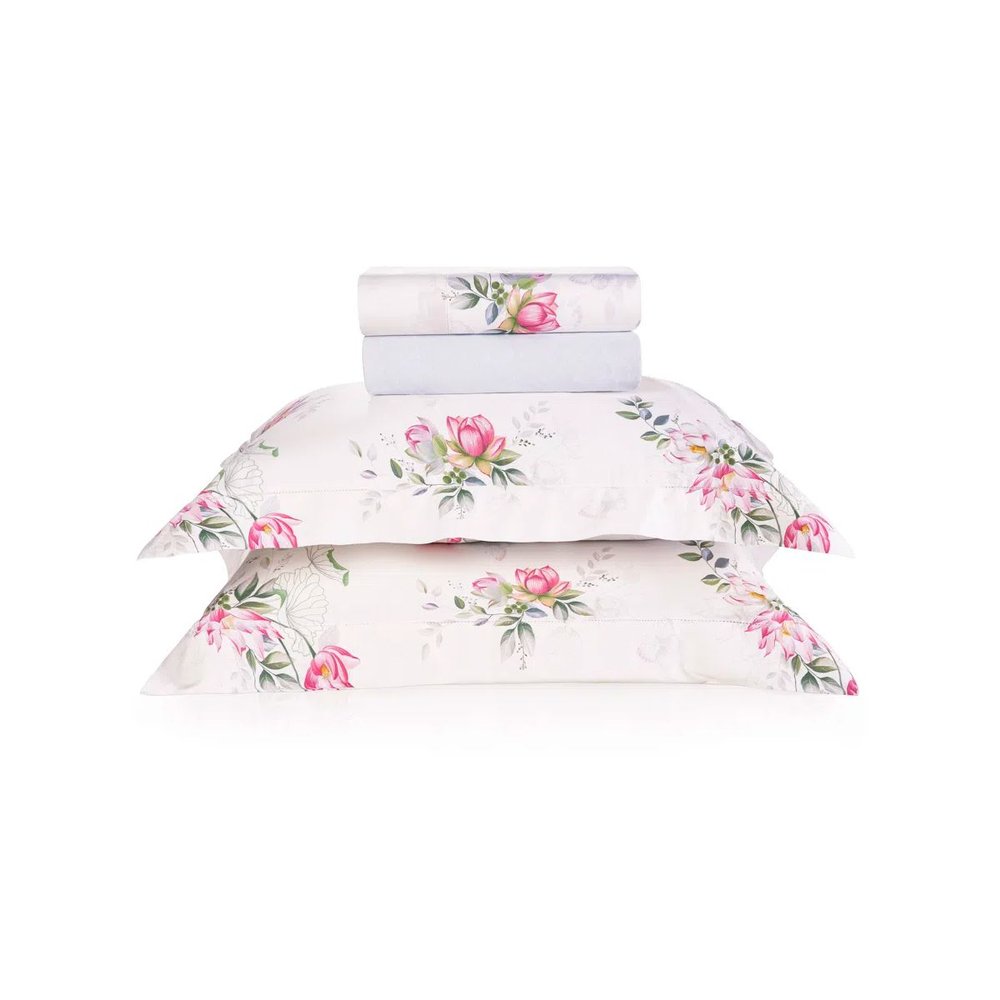 O jogo de cama Trussardi Elisa estampado com flores de lótus combinado com o detalhe em ponto ajour traduz a elegância e delicadeza. O tecido mais nobre do mundo, o 100% algodão egípcio faz com que esse jogo de lençol tenha o melhor toque e o mais macio. Sua confecção em cetim 300 fios potencializa o conforto que a cama Elisa proporcionará na hora do seu descanso!