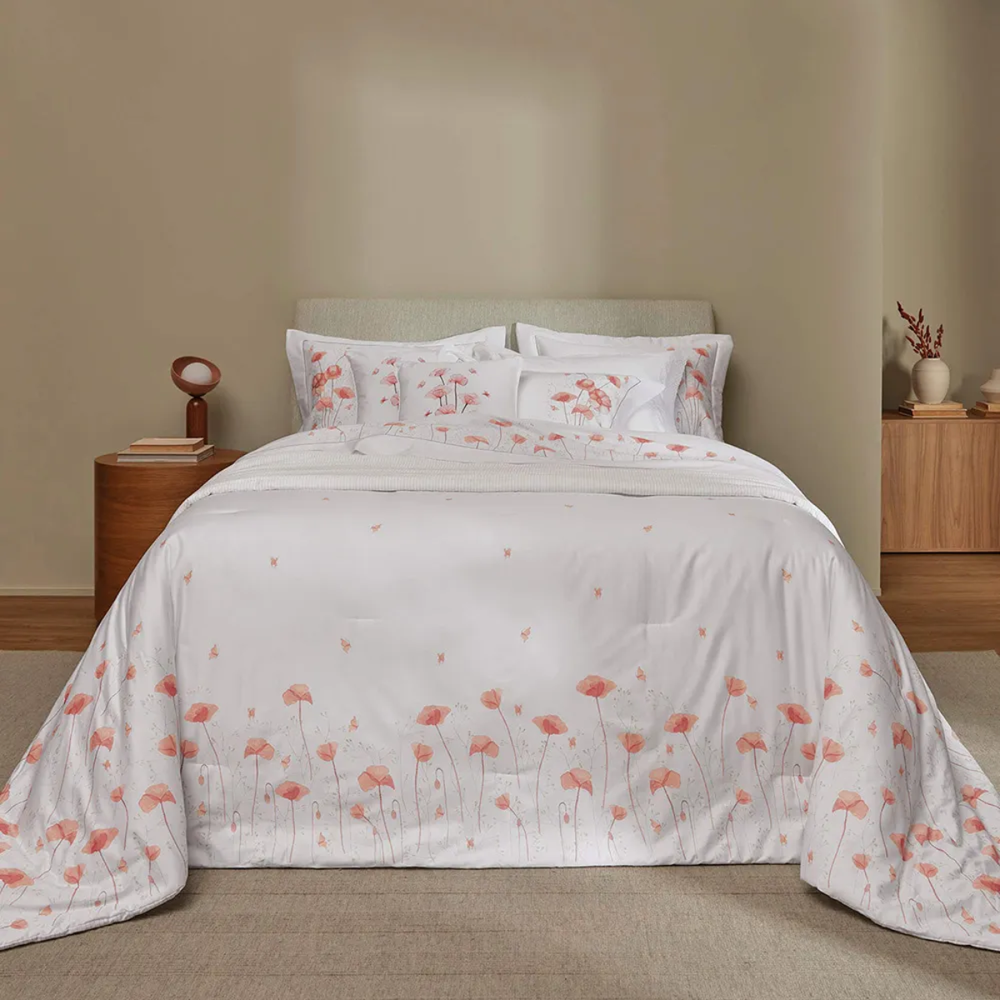 A estampa exclusiva do jogo de cama foi desenhada manualmente em aquarela, com cada pincelada formando pétalas e caules delicados. Essa técnica artística confere um visual sofisticado e autêntico, transformando a peça em um verdadeiro elemento decorativo para o quarto.