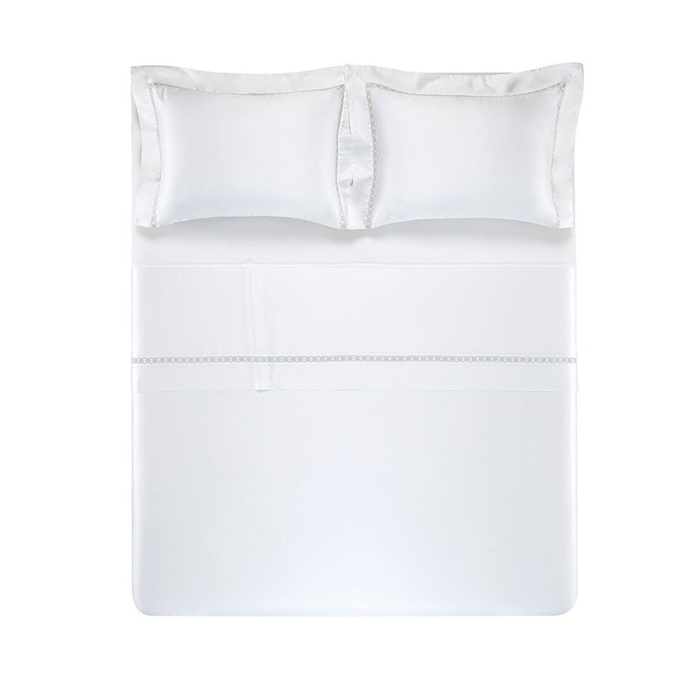 O jogo de lençóis Castellani forma um enxoval encantador e é referência no quesito elegância! O seu lençol de baixo vem com elástico, esse modelo destaca-se pela facilidade de troca e otimização do tempo, já seu sobre lençol possui vira com entremeio bordado assim como suas fronhas, o que traz um acabamento perfeito para a cama.