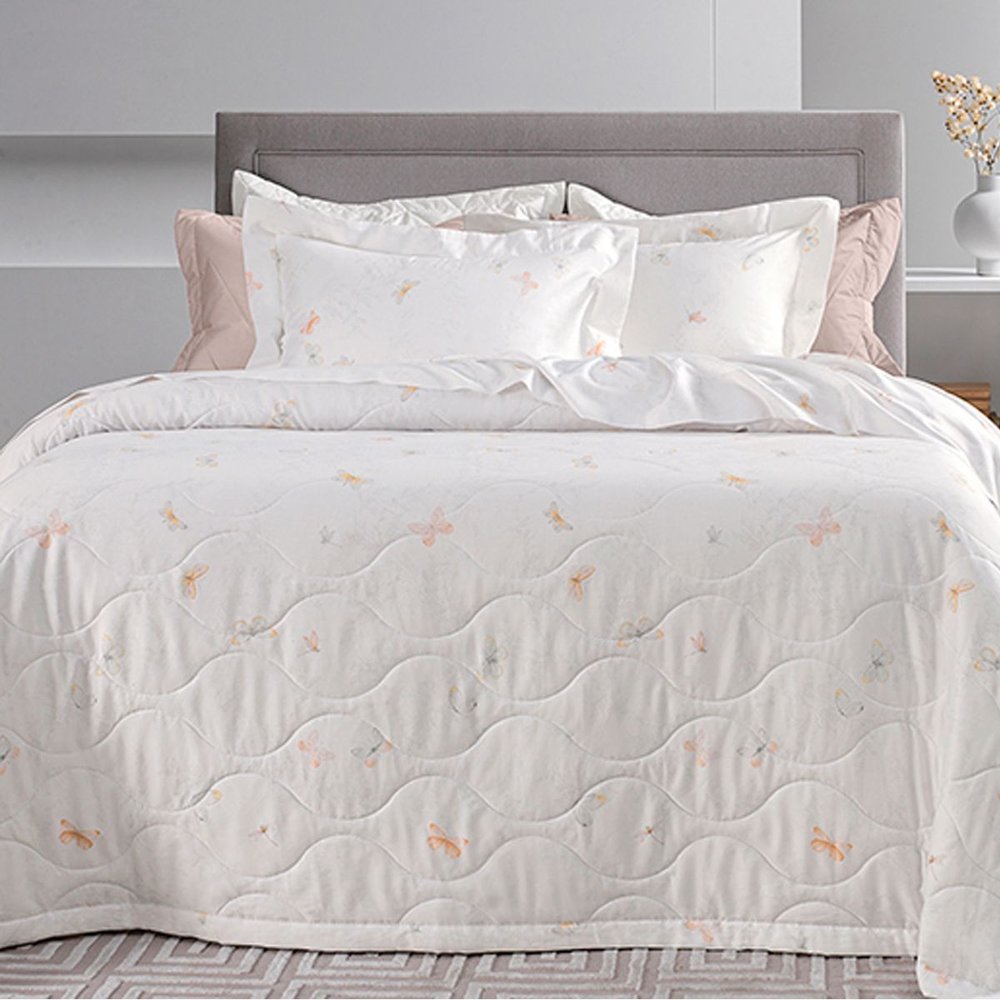 O jogo de cama Trussardi Caterina vem com lençol de baixo com elástico, esse modelo destaca-se pela facilidade de troca e otimização do tempo. Seu sobre lençol possui entremeio bordado assim como suas fronhas, o que traz um acabamento perfeito para a cama.