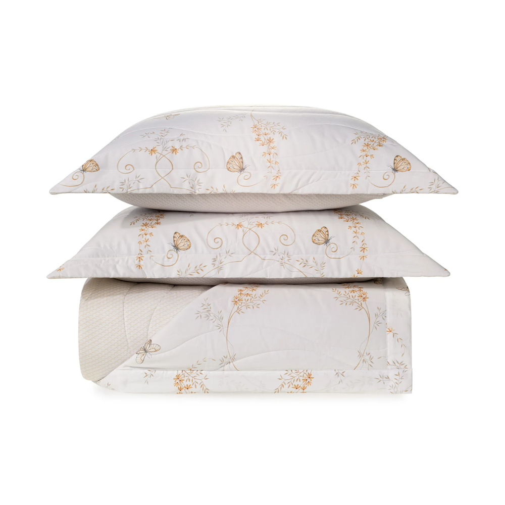 Um jogo de colcha que celebra a essência da primavera com delicadeza e encanto. Flores e borboletas parecem dançar sobre o cetim 300 fios, criando uma verdadeira obra de arte que traz vida e serenidade ao ambiente.