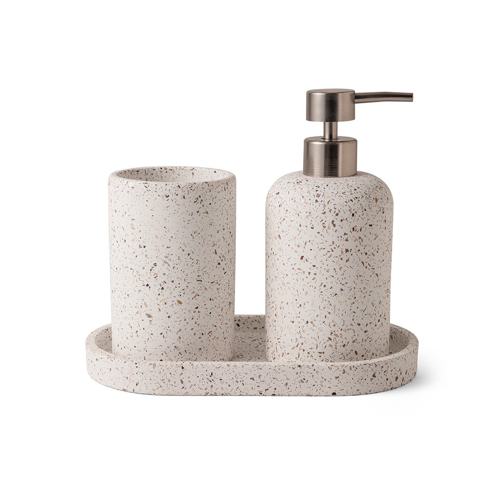 Um conjunto elegante e funcional que oferece tudo o que você precisa para organizar seus itens essenciais de higiene pessoal de maneira sofisticada. O conjunto inclui um Porta-Sabonete Líquido, um Porta-Escovas e uma Bandeja, todos fabricados em cimento de alta qualidade. O Porta-Sabonete Líquido é perfeito para armazenar seu sabonete líquido favorito de forma conveniente e higiênica. Com seu design elegante e bico dosador, você terá fácil acesso ao sabonete, além de manter a pia organizada e livre de bagunça. O Porta-Escovas oferece espaço suficiente para guardar suas escovas de dentes e outros utensílios de cuidados pessoais de forma organizada. A Bandeja completa o conjunto, proporcionando uma superfície estável e elegante para organizar seus itens de forma harmoniosa. Ideal para colocar o conjunto na bancada do banheiro ou no box, a bandeja ajuda a manter tudo organizado e ao alcance das mãos. Dê um toque de estilo contemporâneo ao seu banheiro e mantenha tudo organizado com este lindo conjunto.