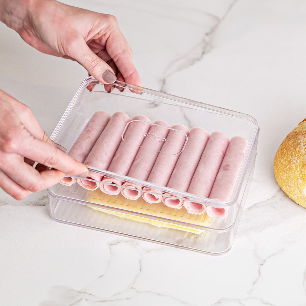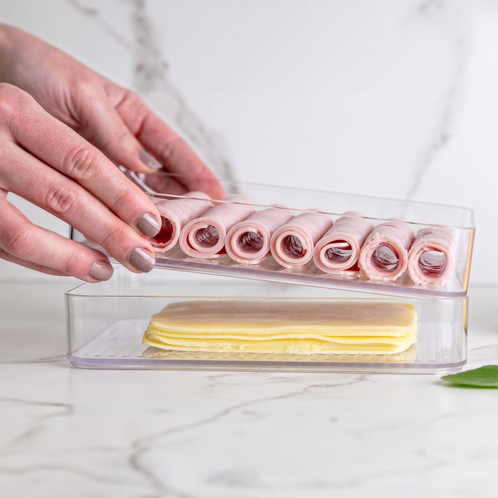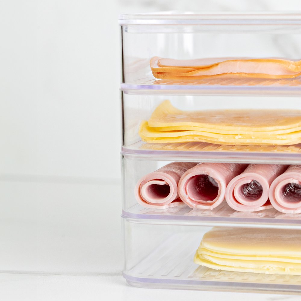 Mais do que um simples porta-frios, a base dupla oferece empilhamento perfeito para otimizar o espaço na sua geladeira, encaixe perfeito das tampas para garantir que seus frios fiquem frescos por mais tempo, base removível para facilitar a limpeza e evitar o contato direto dos frios com a superfície do produto, superfície interna com grade e ranhuras para evitar que os frios fiquem úmidos e garantir a conservação por mais tempo, material resistente e durável feito em poliestireno de alta qualidade, livre de BPA, garantindo a segurança da sua família.