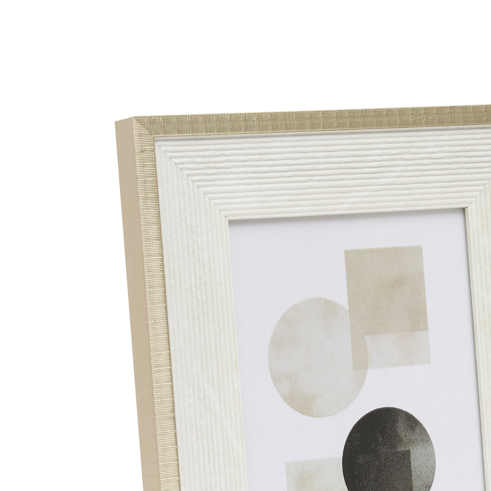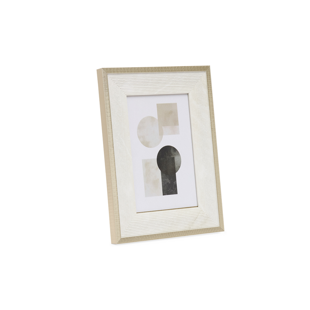 O Porta-Retrato com Borda Dourada e Texturizada é a peça que faltava para dar um toque de requinte à sua decoração. Com um design contemporâneo, ele foge do básico ao apresentar uma moldura larga na cor off-white (creme) com uma textura canelada exclusiva, que traz profundidade e interesse visual à peça.