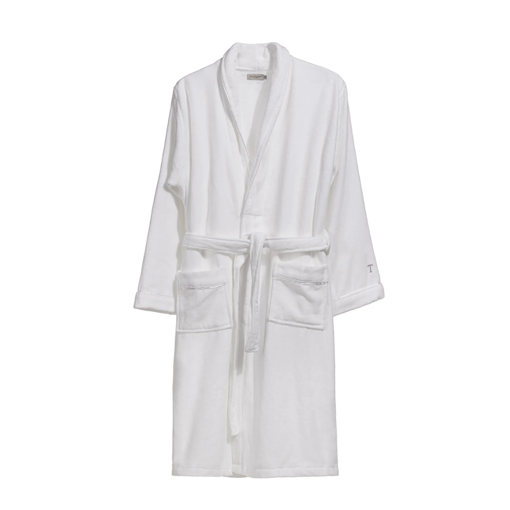 Os roupões Trussardi são um verdadeiro convite ao conforto absoluto. O modelo Barone, feito com algodão de tecnologia Cottone Speciale, envolve o corpo em uma sensação aveludada incomparável. A nova modelagem, com detalhes refinados como o bordado do "T" nas mangas, adiciona um toque de sofisticação discreta. Suas fibras leves proporcionam um caimento perfeito, transformando seus momentos de relaxamento em uma experiência digna de spa no conforto do lar.