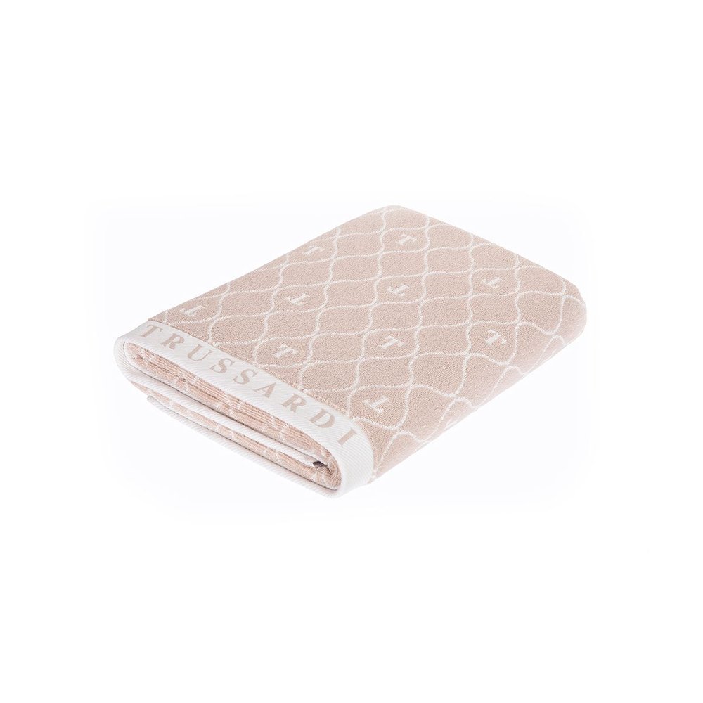 A Toalha Trussardi Speciale foi desenvolvida com fio dupla torção e técnica de jacquard fio tinto, no corpo a toalha traz um exclusivo monograma Trussardi e logo bordada na bainha.